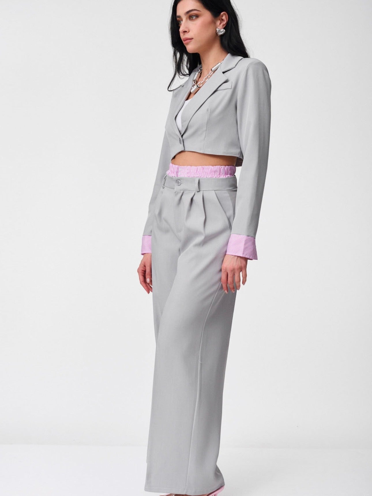 Completo dal taglio femminile e contemporaneo, pensato per slanciare la silhouette e creare un look completo in un solo gesto.