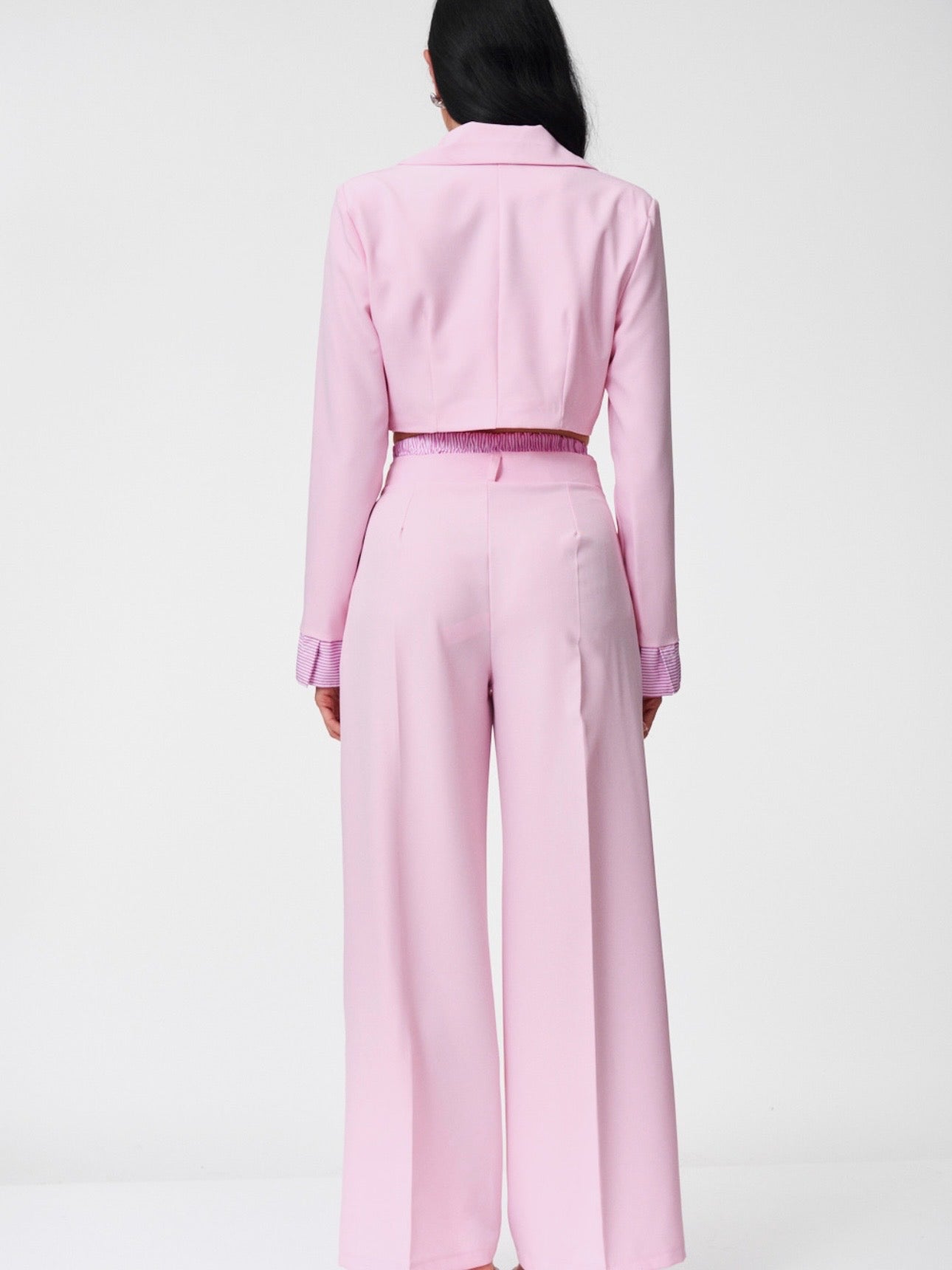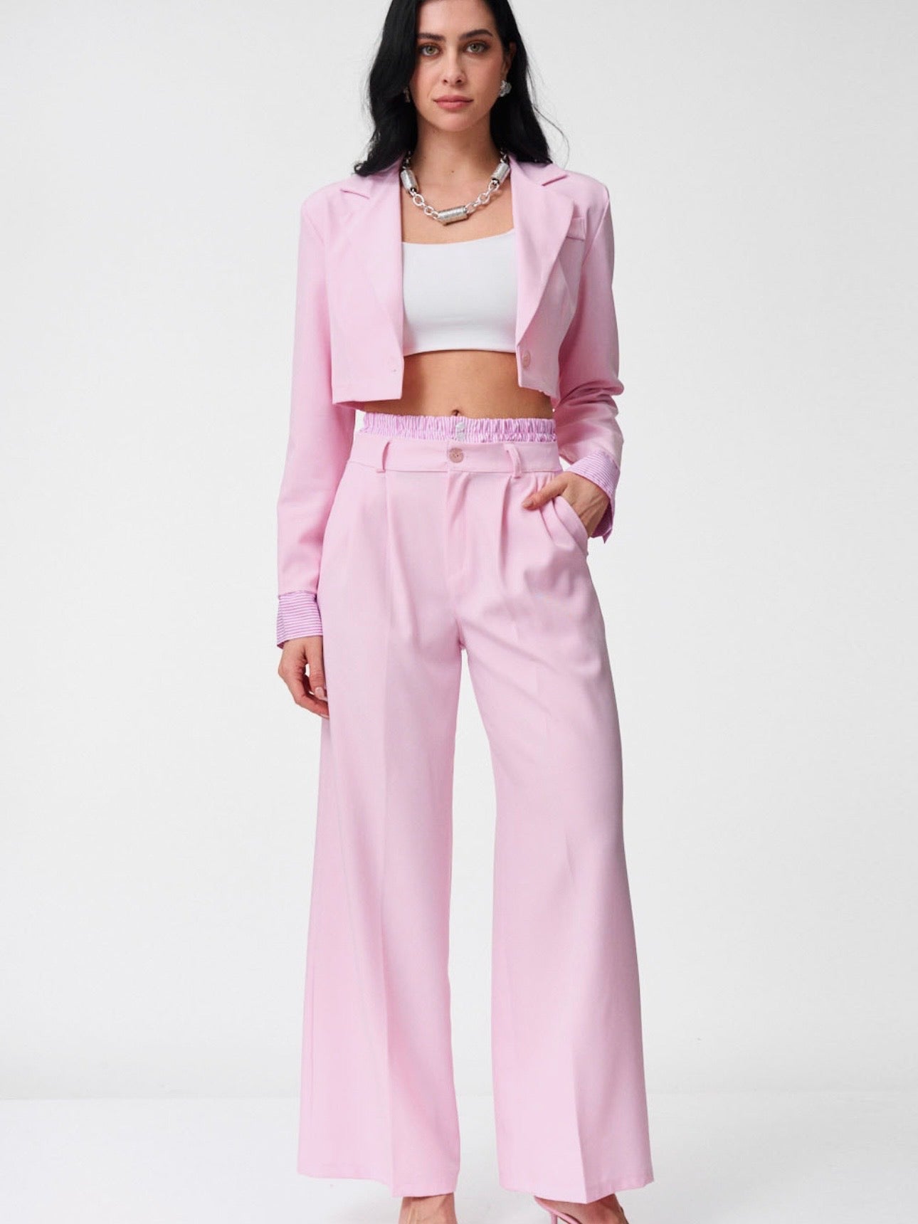Completo dal taglio femminile e contemporaneo, pensato per slanciare la silhouette e creare un look completo in un solo gesto.