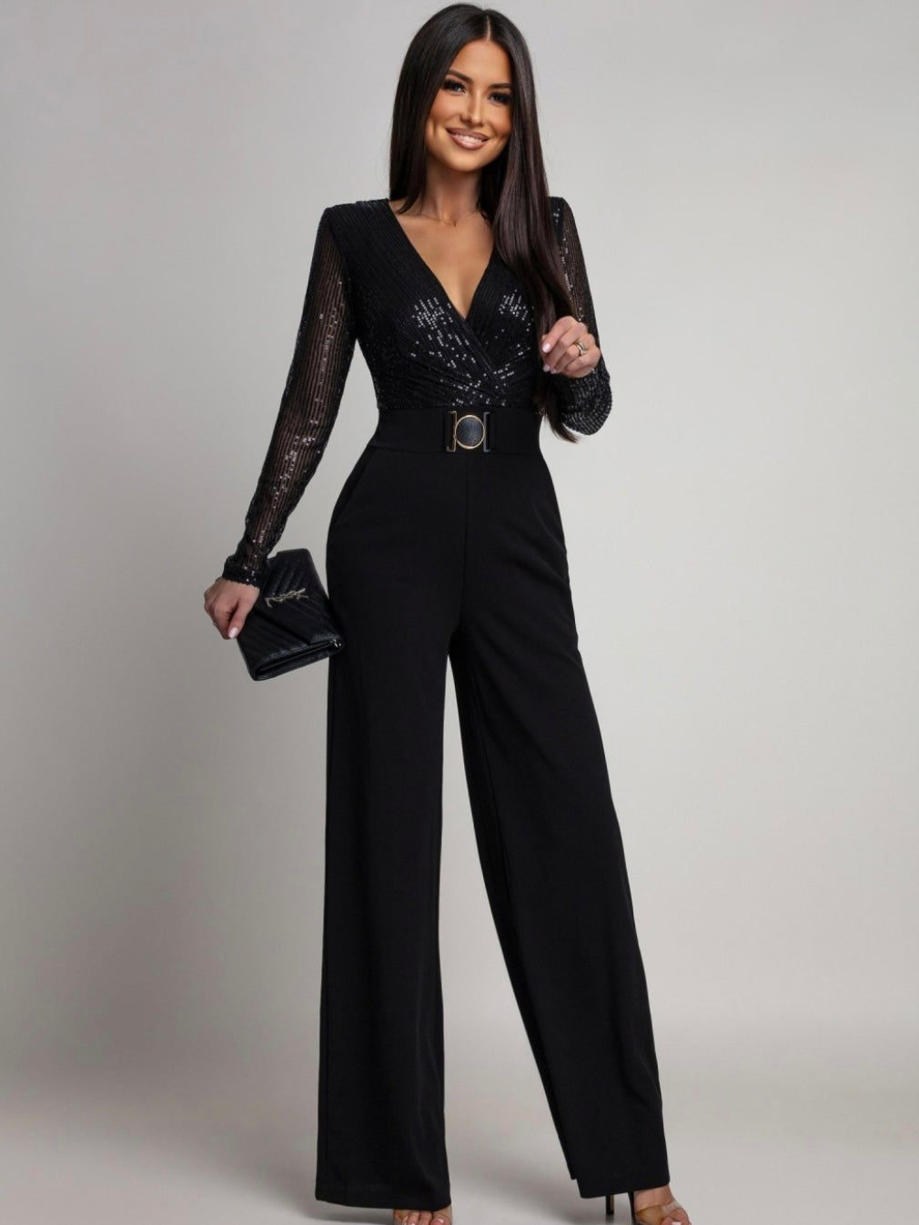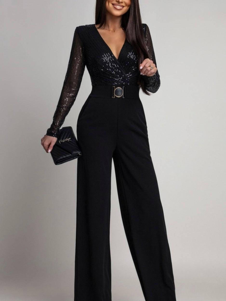 Tuta in paillettes dal taglio femminile e contemporaneo, pensata per slanciare la silhouette e creare un look completo in un solo gesto.
